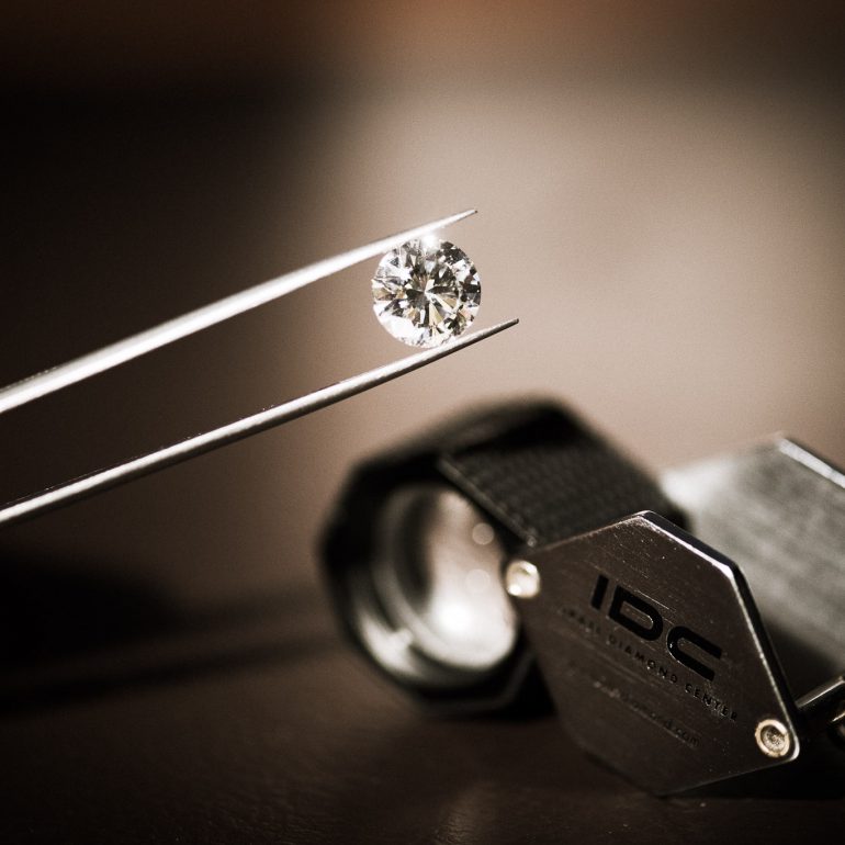 יהלום מוחזק בפינצטה מתחת לזכוכית מגדלת