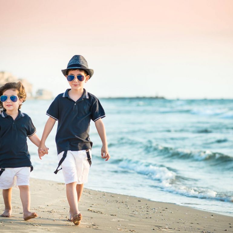 ילדים הולכים על החוף עם יפו העתיקה ברקע