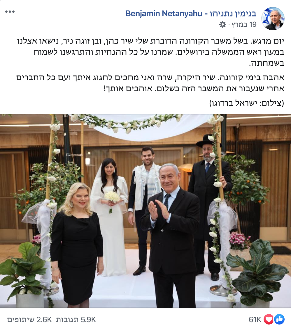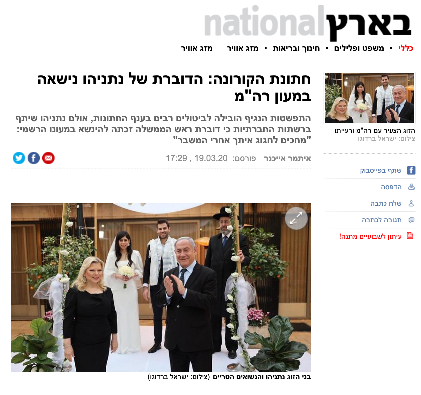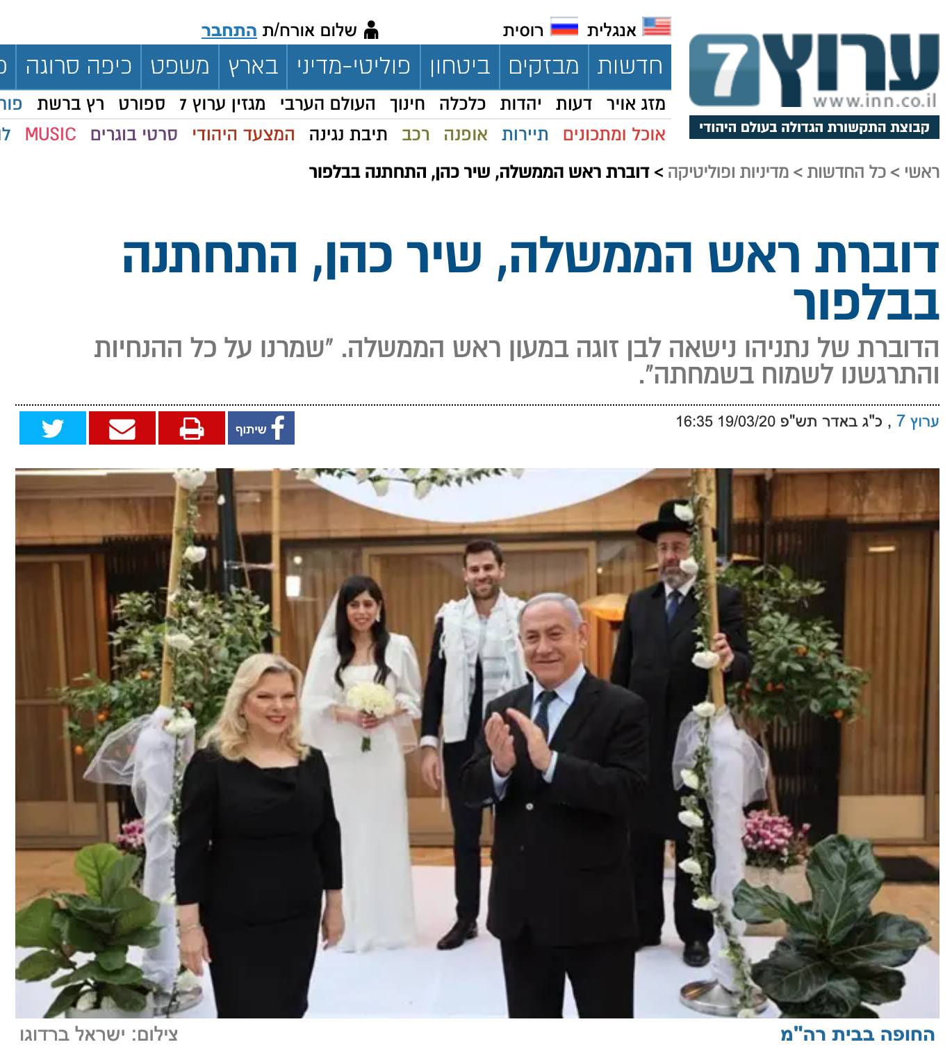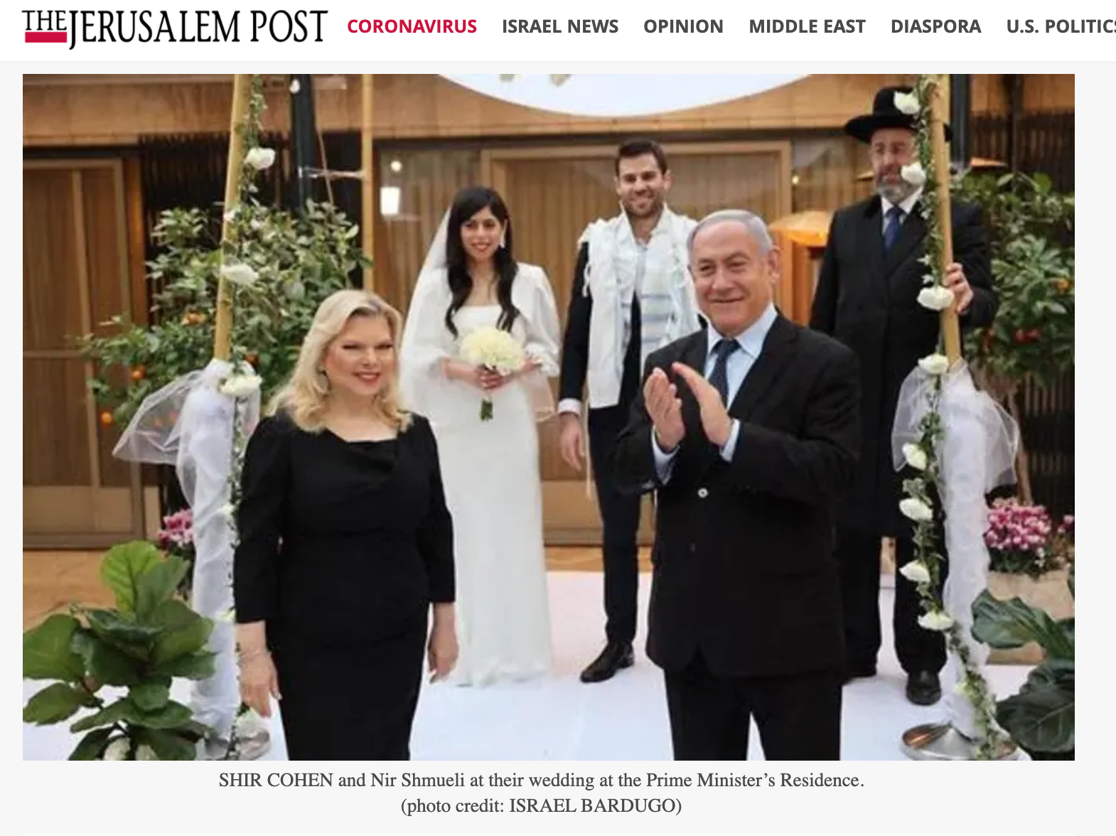 סיקור תקשורתי נרחב של צילום חתונת דוברת ראש הממשלה, שיר כהן ובן זוגה ניר, שהתקיימה במעון הרשמי ברחוב בלפור בעיצומו של המאבק במגפת הקורנה