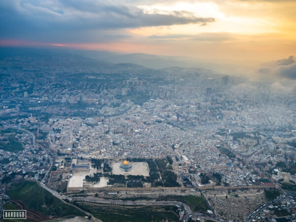 Aerial photo of Old City of Jerusalem at sunset, for commercial use as a downloadable file, or printed on a top-quality photography-paper, and framed in luxurious acrylic-glass for luminous colors and impressive depth effect. The backing is made of light yet sturdy aluminum, for safely hanging on walls.